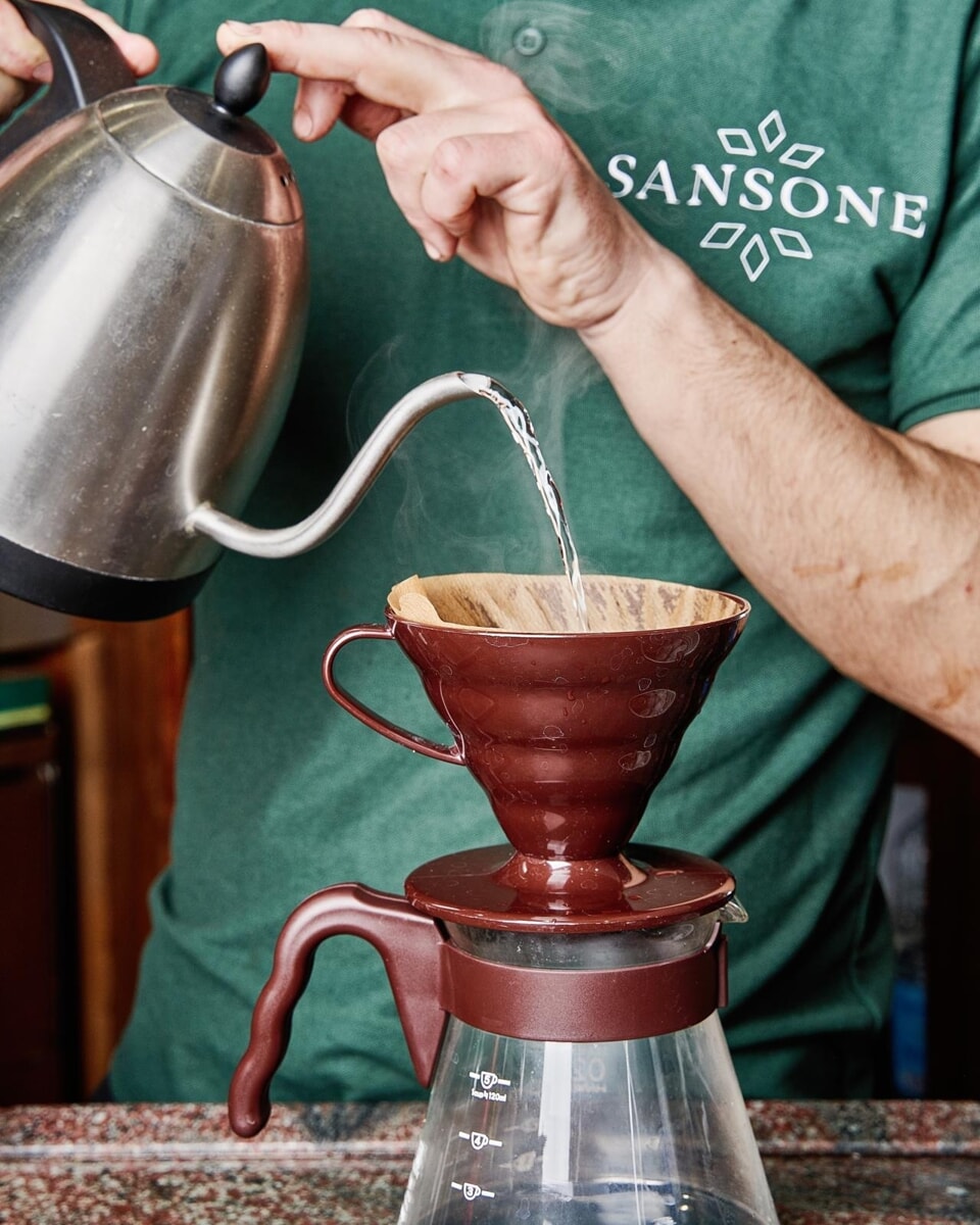Sansone si è formato sul green coffe (i ‘chicchi verdi’, ovvero la materia prima ancora non torrefatta e tostata), poi sul lato sensory, quindi sulle tecniche di assaggio e degustazione per riconoscere la qualità del caffè: “Tutti e due aspetti imprescindibili, se hai in mente di lavorare ai tuoi blend”. Ha proseguito col brewing, che si riferisce ai metodi alternativi di estrazione che valorizzano i vari chicchi, passando da French press ad aeropress, dal chemex al V60.